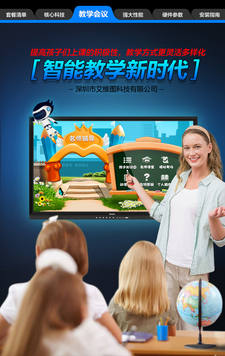 AW系列-多媒體教學一體機,高清大屏顯示,壁掛支架多種使用方式,人性化機型設計,立式與掛式兩種使用方法可交替使用,避免使用環境發生變化時產生的資源浪費問題采用LED背光源長壽命,低功耗,環保節能。智能電子白板,各種文件一鍵加載,多點觸控智能電子白板適用于各種商務會議,支持手寫批注,兼容日常office辦公軟件,本地、U盤、網盤、局域網數據輕松駕馭。書寫流暢,減少視覺誤差,高端企業必備,多重主題背景,筆形色彩,任意選擇。高端配置 讓運行速度,完美兼容WIN7,WIN8 隨意切換。