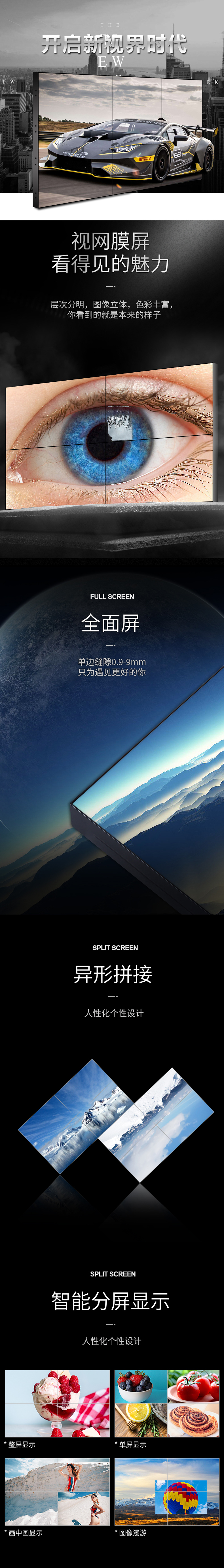 55英寸0.88mm液晶拼接屏應具有極高分辨率、可調亮度和對比度、范圍寬,色彩還原真實,圖像失真小,亮度均勻,顯示清晰,系統操作簡單,維護方便,使用壽命長。55英寸超窄邊液晶拼接屏,既能單獨作為顯示器使用,又可以拼接成超大屏幕使用。根據不同使用需求,實現可變大也可變小的百變大屏功能:單屏分割顯示、單屏單獨顯示、任意組合顯示、全屏液晶拼接、雙重拼接液晶屏拼接、豎屏顯示,圖像邊框可選補償或遮蓋,支持數字信號的漫游、縮放拉伸、跨屏顯示,各種顯示預案的設置和運行,全高清信號實時處理。